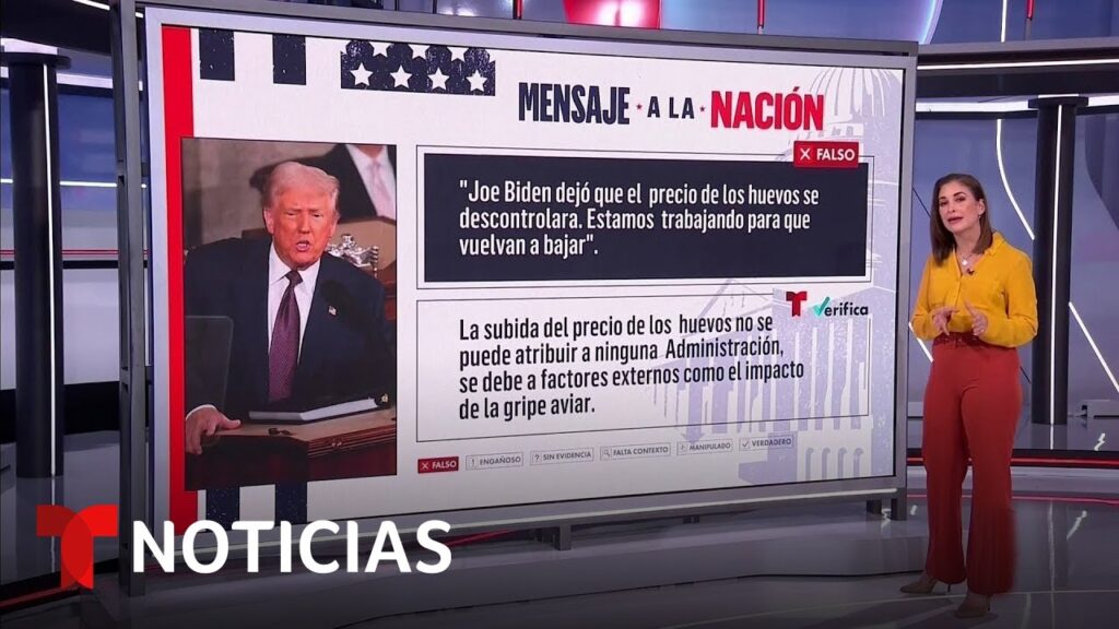 Video oficial de Noticias Telemundo. T-Verifica, el equipo de verificación de datos de Noticias Telemundo, halló falsedades del presidente como achacarle el aumento en el precio de los huevos al Gobierno de Biden, algo que no se le puede atribuir a la antigua ni a la precise Administración.