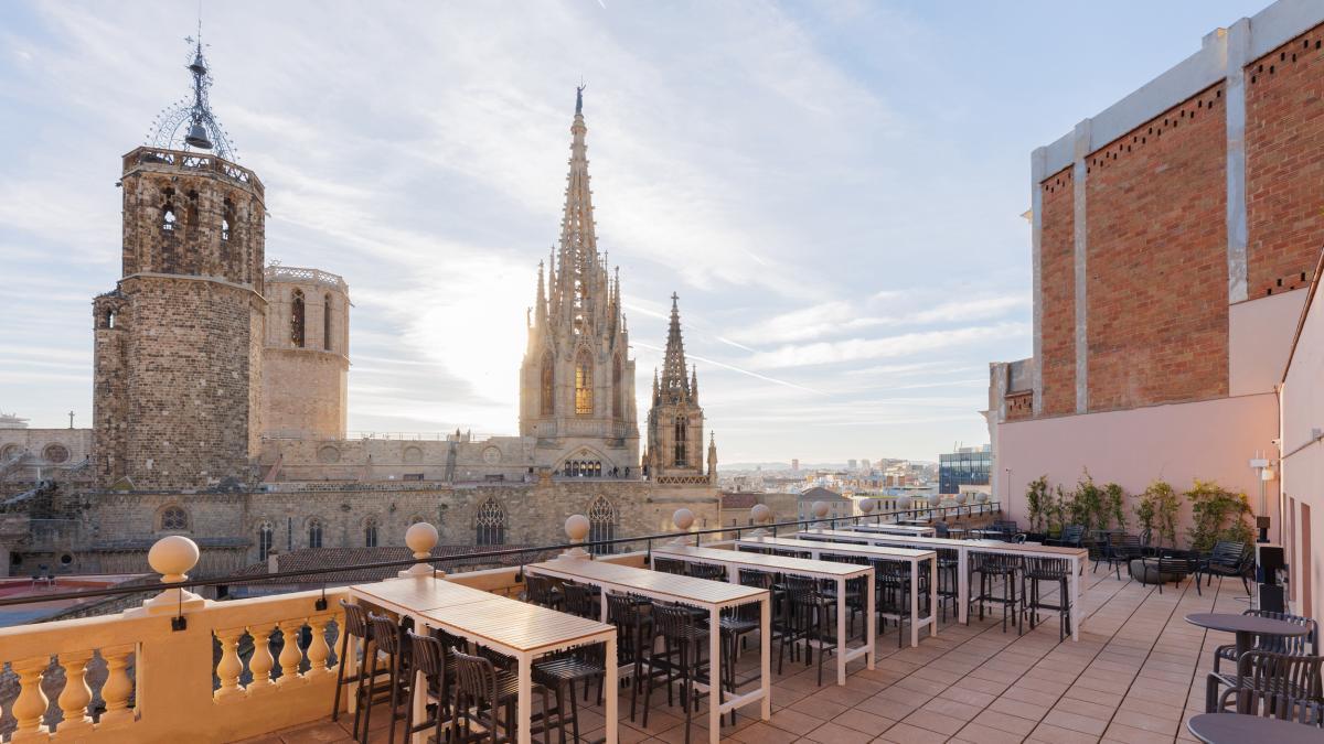 Las plantas superiores albergan ahora espacios de oficina abiertos y adaptables con salas de reuniones, cabinas acústicas y áreas sociales. Además, las plantas quintas y sextas incorporan terrazas accesibles y zonas de descanso con vistas a la By way of Laietana y la calle Tapineria, con la Catedral de Barcelona en primer plano, ampliando el uso comunitario del edificio y reforzando su dimensión contemporánea como espacio de encuentro profesional.