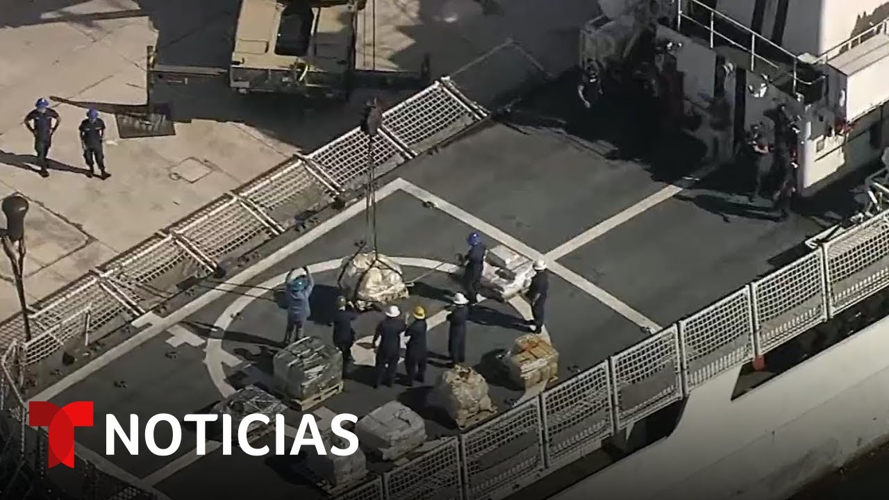 La Guardia Costera de Estados Unidos descarga 12,471 libras de drogas en Miami Seashore. El cargamento de más de $140 millones fue confiscado durante una redada antidrogas en el Caribe.