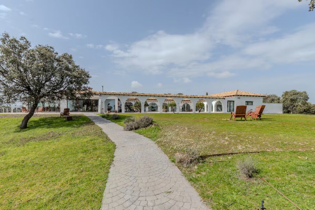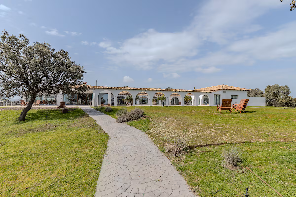 La dehesa extremeña se alza esta finca de 70 hectáreas que limita al sur con el embalse de Valdecañas. Preside la propiedad un antiguo cortijo, en su día dedicado a las labores agrícolas, que ha sido convertido en una residencia de espacios amplios y luminosos. Esa vivienda, localizada en un municipio del Campo Arañuelo, en la provincia de Cáceres (Extremadura), suma 650 metros cuadrados en una sola planta y se organiza en torno a un gran patio central empedrado con arcadas que conectan las diferentes estancias.
