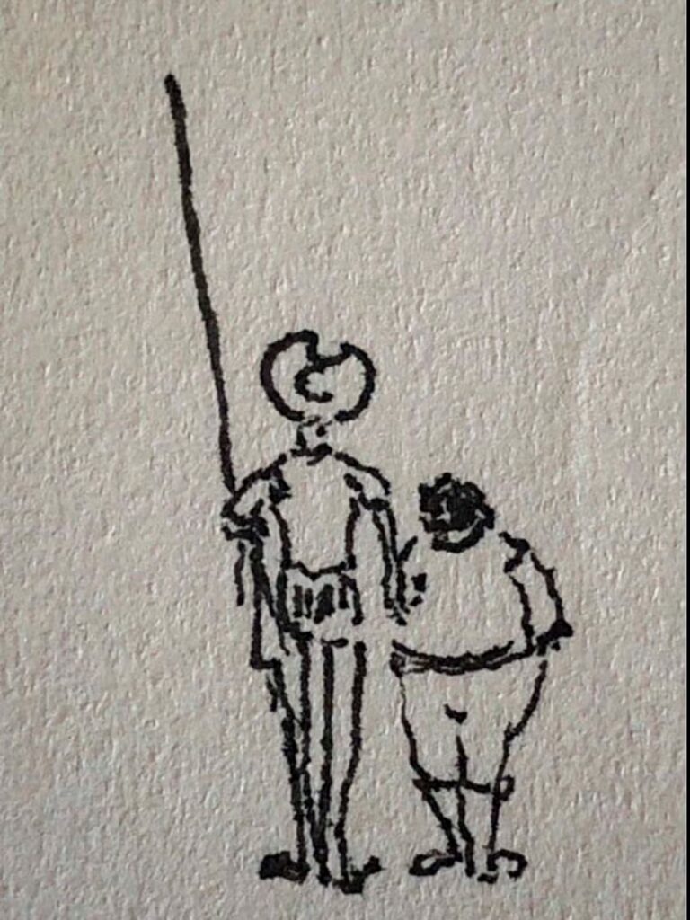 Tres siglos antes, al pie de la Sierra Morena, Sancho y Quijote se encuentran con la mochila de Cardenio que entre otras deshilachadas magias contiene un llamado Libro de Memoria, que sería justo describir como el remoto antecedente de un iPad de pantalla táctil -no de pixeles, sino de cera lisa. Cuando el Caballero de la Triste Figura determine quedarse en esa sierra para martirizarse por las cuitas y pendencias de su amor por Dulcinea, Sancho se compromete a llevarle una misiva a la Musa en su palacio de El Toboso, mas por un despiste olvida la memoria tallada en la pill y tanto su señor Don Quijote como él mismo quedan expuestos a un vacío desolador.