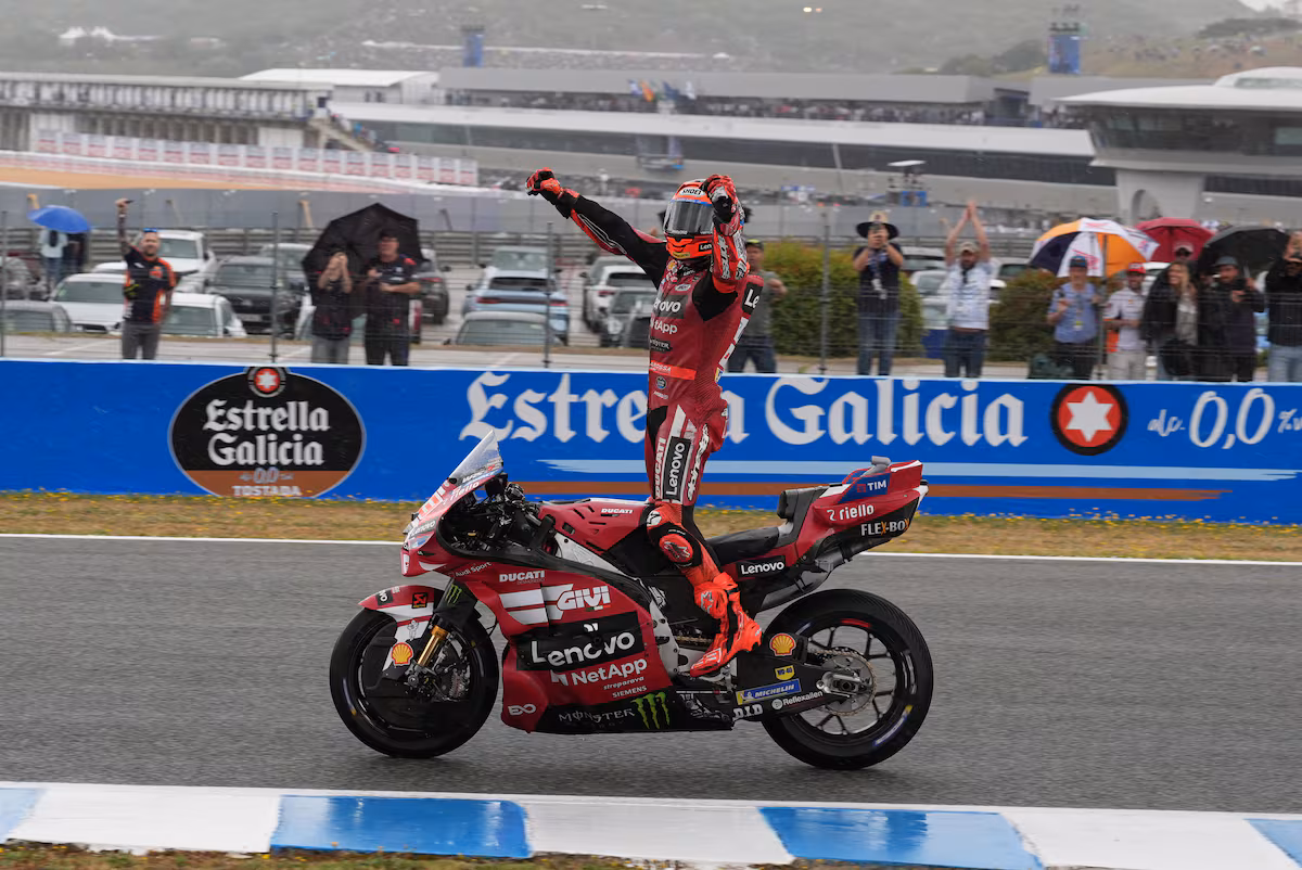 Marc Márquez dijo el viernes que no bailaba encima de la moto desde el GP de Japón del año pasado, cuando ganó su séptimo título mundial en MotoGP. “¿Me habré olvidado, quizás?”, bromeaba. Este sábado quedó claro que no. En una jornada caótica, el campeón del mundo desplegó su navaja suiza de habilidades para llevarse la pole y la victoria al dash, superando incluso una caída. Ante la afición entregada, que aguantó primero el chaparrón matutino y luego otro vespertino en Jerez, el piloto español de Ducati bailó de lo lindo sobre el asfalto mojado y pilotó de manera espectacular y astuta para ponerse a tiro este domingo (14.00 horas, DAZN y Telecinco) de su victoria mundialista número 100.