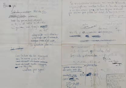 Miguel Aute, al teléfono, recuerda cuando en casa pasaba por delante del despacho de su padre, Luis Eduardo Aute, y este andaba en busca de las musas. “Le oía cantar bajito. No le gustaba enseñar lo que componía hasta que consideraba que letra y música estaban terminadas”. Su hijo visualiza aquel despacho, “extremadamente ordenado en su caos; él decía que todo estaba en perfecto desorden”. De Aute, fallecido en 2020, se incluye la composición Mojándolo todo, en una hoja en la que a la letra le acompañan algunos dibujos infantiles de su hija. “Trabajaba desde que se levantaba hasta la noche, solo paraba para comer y cenar”, añade su hijo, que anuncia que entre los papeles y objetos del legado de su padre hay un cuaderno con dibujos y poemas que le gustaría editar un día.